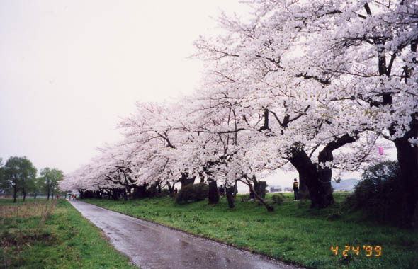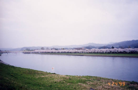 北上川の東岸展勝地の櫻は、大正9年元黒沢尻町長らが発起人となり、櫻を植えたのが始まりで、翌大正10年開園。その後洪水で大きな被害を受けたりしたが、地域住民の熱意で見事に復興した。展勝地とは展望の利いた景勝の地という意味からきているという。園内には約1万本の櫻があるというが、圧巻は珊瑚橋からレストハウスに至る約2キロにおよぶ櫻並木である。「さくらまつり」期間中の特定日には北上駅裏からの無料渡し舟が運航され、地元高校生による「飯豊鬼剣舞」などが披露される。園内には「みちのく民俗村」「サトウハチロー記念館」「北上夜曲の碑」など見るべき所も多い。 |