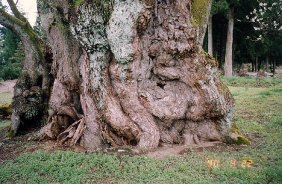 この樹は、伊佐沢の久保櫻とは長井の駅を挟んで反対側にある。元々農家の奥庭でひっそりと咲き誇っていたものを、数年前画家であり、巨樹の会を主宰している平岡忠夫氏が見いだし、日本一の櫻の巨樹だとして長井市長などに働き掛け、市指定天然記念物となった。支柱も無く枝張りも均整がとれていて王者の風格充分。昔伊達政宗が鮎貝城攻略の際、戦い利あらず、この櫻に隠れ命拾いをしたという伝説がある。