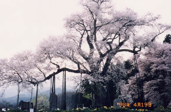 「釜の越」は古い地名で、昔八幡太郎義家が此所の石で竃を築き、兵糧を炊いたという伝説が残されている。幹周り6m、太枝の1本が大きく東方に張り出し、支柱に支えられながらも雄大な感じに咲き誇り、県内有数の名木である。バックの雪山との対比が素晴らしい。開花時にはライトアップされ、地元高玉芝居の公演もある。