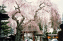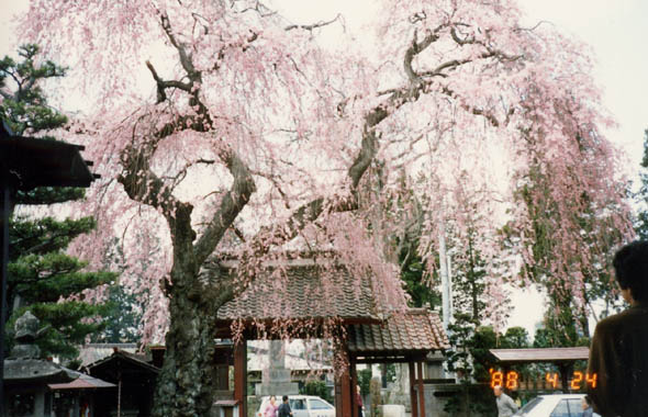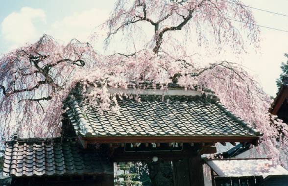 白河駅の南、市役所先の寺町の一角に妙関寺がある。門を入ると直ぐ右手に枝垂櫻の大樹があり見る者を圧倒する。この樹は今より三百数十年前、仙台の伊達政宗が将軍家へ櫻苗木を献上の途中当寺で休憩したが、その折当山住職がその1本を所望し、境内に植えたと伝えられている。この種の櫻は前橋、宇都宮にも植えられたそうだが現在残っているのはここだけとの事。濃い紅色の枝垂れるさまは濃艶そのもの、寔に見事である。昭和38年、市指定天然記念物。