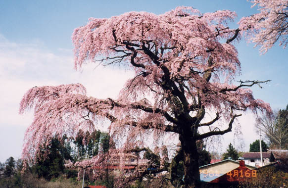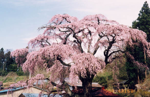 伊勢松櫻から尚暫らく行くと、道の左側に濃い紅色の大きな塊りが見えてきた。紅枝垂地蔵櫻である。中田町には枝垂櫻が13箇所もあるようだが、中でも一番の巨木がこの木である。木目沢地区の地蔵堂の傍らにあるので、紅枝垂地蔵櫻という。地上25mの所から1本の太枝が西に伸びて大きな樹容を形成。濃い紅色の花がしだれて咲き乱れ樹勢も旺盛である。人家の脇で人と車が多くカメラアングルが難しい。