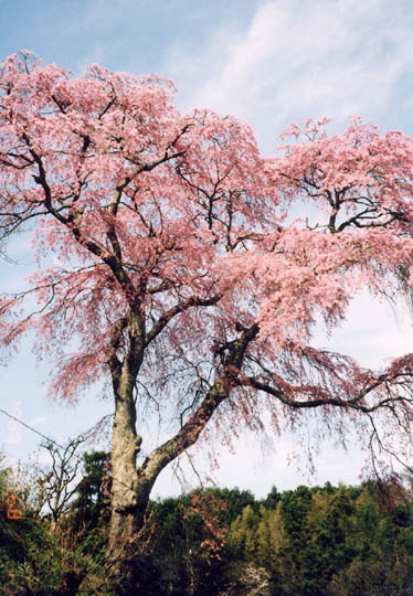 木目沢の西、牛縊本郷の道路脇斜面に立つ。この木も濃い紅色の枝垂櫻で樹勢の良い若木である。
