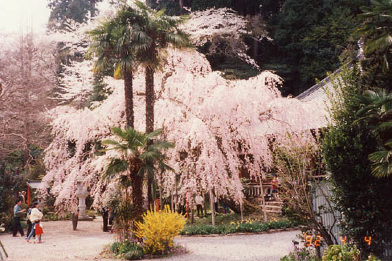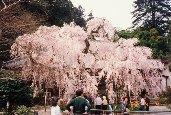 栃木駅の西方約4kmほどの大平山は関東平野の一番近い展望地。櫻と紫陽花が有名だが、手近なハイキングコースとしても四季を問わず人を集める。その山麓に太山寺がある。徳川三代将軍家光公の側室、お楽の方が病気療養のため太山寺に滞在のみぎり、お手植えされたものと伝えられている。本堂前にある紅枝垂櫻は丁度満開で、樹の姿も大変宜しい。櫻並木の道を謙信平まで登り、茶店で名物大平だんごと、やきとりで一息いれて、大平山神社の隋神門より表参道の石段道700段を一気に下る。 |