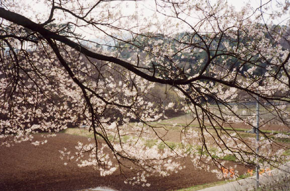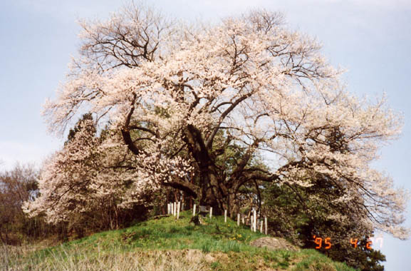 沼田駅より天狗の大面で知られる迦葉山行きのバスで中発地下車、歩いて15分程の所にこの樹はある。山裾の小高い丘の中腹に、こんもりと枝を拡げ、今日が最高という花盛りである。樹下で先程需めた地酒「利根錦」をやりながら弁当を開ける。訪れる人とて無く暫し満開の櫻をひとり占めする。眼下にはリンゴ畑が拡がり足元にはタンポポと蝶。至福の一時を過ごす。かっては苗代作りの頃に開花するので「発地の苗代櫻」とも呼ばれていた。昭和32年県の天然記念物に指定される。道の奥にお寺の赤い屋根が見えたので訪れる。迦陵山慶福寺である。門前に水仙の花に囲まれて石造の閻魔像と奪衣婆像が鎮座。庭には梅、桃、櫻が一度に咲き競っていた。畑仕事の手を休めた奥様がお茶を入れて下さる。 |