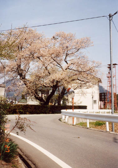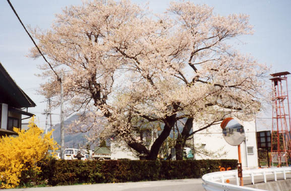 後閑駅西の村主神社から数百米先の県道分岐点に立つ。この櫻は室町時代中期、名胡桃城主・沼田三郎影冬の姉、如意姫が京都より齎らしたものという。街道の分岐点で人家も近く、車の排気ガスも多そうだが、樹勢も盛んで花付きも良く中々風格のある古樹である。樹下の黄色いレンギョウとの対比も美しい。昭和27年県の天然記念物に指定。