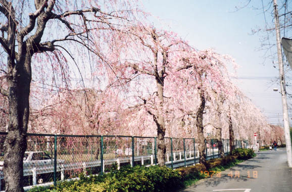 西武池袋線・小手指駅の北西700米程の所に砂川堀がある。長さ400米程の堀川の両岸に枝垂櫻が立ち並び、青空をバックに咲き誇る。まだ若木だが樹容の素晴らしい樹もあり、紅枝垂系は少し早かったが、濃淡のピンクも変化があって良かった。枝垂櫻だけの並木というのは数少ないように思われる。