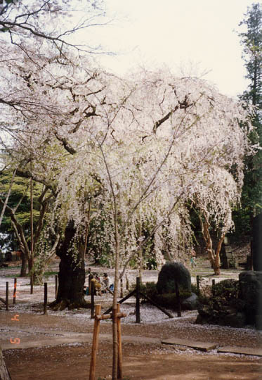 総武線市川駅から北へ真っすぐ一本道を15分ほど行くと、真間山弘法寺に着く。この寺は天平の昔行基菩薩が開基、その後空海によって七堂伽藍が造営されたという伝説が残る古刹である。境内に「臥姫櫻」と呼ばれるに枝垂櫻の老樹がある。主幹の一部が折損してトタンのカバーで覆われているのが痛ましいが、数米に及び枝垂れるさまは寔に見事で、かって富安風生は次の句を残している。「まさをなる空よりしだれざくらかな」。境内奥に小振りな紅枝垂櫻の若木が1本満開。小さな紅傘を拡げたような姿は艶麗そのものだった。
