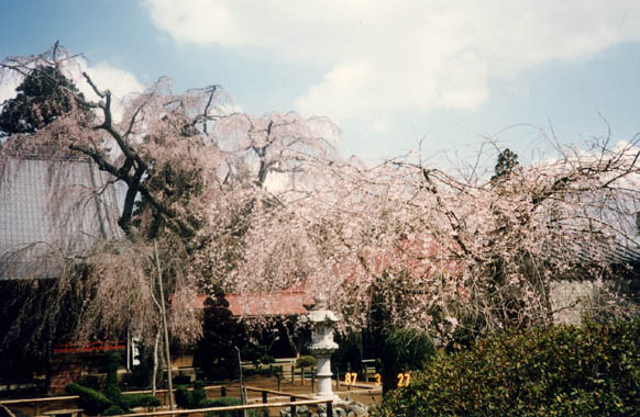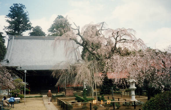 総武線八街駅より成東行きバスで約15分妙宣寺下車。妙宣寺は「鍋かむり日親上人」で有名な日蓮宗第三祖の日親上人誕生の地である。長光寺の隣りだが此所にも同じ位の大きさの枝垂櫻がある。上部の小枝の付き具合が一寸良くないのが残念。 |
