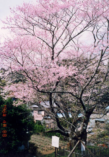 千葉県のほぼ中央に位置する東金市。その西郊山田地区の貴船神社近くに墨染櫻がある。この樹は西行が東大寺再建の勧進の途次、この地に挿した櫻の杖から芽吹いたものという伝説がある。現在の樹は3代目。花色は桃紅色で、紅色のウバヒガンの名木は全国的にも珍しいようである。「深草の野辺の櫻木心あらば亦この里にすみぞめに咲け・西行」昭和51年、市指定天然記念物。