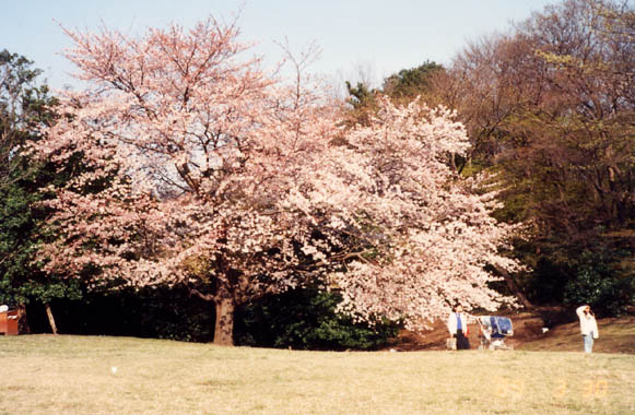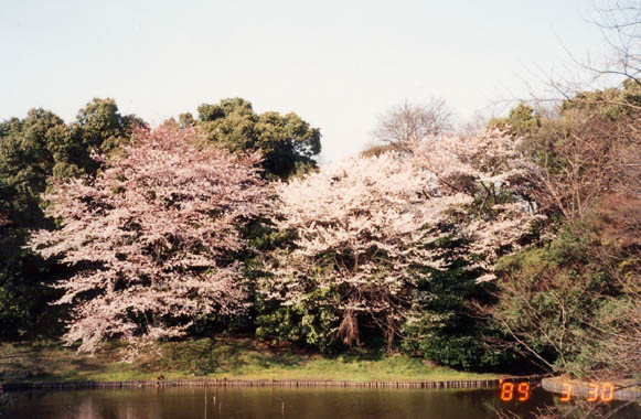 明治神宮北側にある宝物殿前の池畔に、数本のソメイヨシノの大木がある。