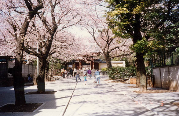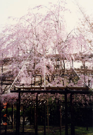 池袋駅から明治通りを南へ行き、雑司谷小学校の脇を入って暫らく行くと、威光山法明寺に着く。此所は室町時代より子供の守り神として有名な、雑司が谷鬼子母神堂の本坊である。本堂左手に枝垂櫻の大樹がある。3段に組まれた傘型の支柱に支えられて、咲き誇っていた。本堂側から見ると均整もとれて美しく見えるが、西側の枝が少ないのが一寸残念。まだ若木なのでこれからの成長が楽しみだが傘竹の多いのが気になる。境内には外にも、山櫻や八重櫻、染井吉野の大木もあり、1ヶ月に亘り櫻が楽しめる。参道の櫻並木も絶好の花見場所を提供してくれる。 |