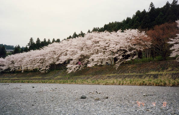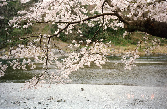 青梅駅の真南0.8kmほどの地に、多摩川に架かる人道橋「鮎見橋」がある。両岸の土手に櫻並木が連なりのびやかな風景を作り出している。櫻堤下の多摩川の川原に下りて、散り始めた花ビラをさかなに、先程需めた地酒「澤乃井」をやる。多摩川もこの辺はまだ綺麗で、鶺鴒などの水鳥も見られ、遠くには釣人の姿も望まれ、まことに長閑な至福の一時を過ごす。橋畔には青梅市郷土博物館と国指定重要文化財の旧宮崎家住宅がある。