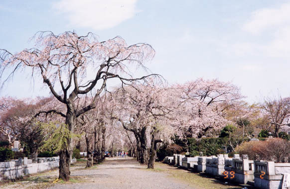 大正12年、わが国最初の公園的風景を取り入れた大規模な墓地として開設された。各界著名人も数多く眠るが、春ともなると園内各所に植えられた櫻並木が一斉に花開き多くの人々が訪れる。西側中央付近の通りは「しだれ櫻並木」と命名され、文字通り枝垂櫻の並木が続き素敵な空間を造り出している。