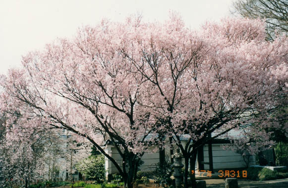 東京のベッドタウン、多摩センター駅の東0.8km程の地に吉祥院がある。山門を入った右手庭先に、信州・高遠家門外不出の「コヒガンザクラ」の若木が艶然と微笑んでいた。傍らに「都天然記念物・吉祥院のシダレザクラ」の標柱がある。寺の縁起書によると「鎌倉時代よりの樹令600年の枝垂櫻は昭和39年の台風で惜しくも壊滅したが、その見事な姿に感動した井上靖は小説「憂愁平野」にその思いを綴っている」とあった。 |