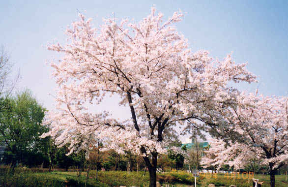 第二次大戦後、大企業の工場跡地を公園とした。道を挾んでで2地区に分かれ夫々に櫻が植えられ憩いの場を提供している。