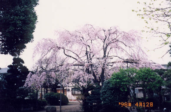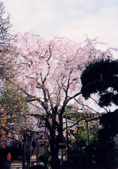 小田急線成城学園前駅より南1.5km程の地に、宝寿院光伝寺がある。永禄12年(1484年)創建と伝えられる古刹で、明治時代には喜多見小学校として使われていた。本堂前庭にあるその樹は、とても樹令40年とは思えぬ見事な枝の拡がりを見せ、今日、明日が終わりかと散り急いでいた。昨夜はライトアップされた枝垂櫻の下で、琵琶の弾き語り「平家物語」の公演があったようだ。近くには世田谷区立次太夫堀公園民家園があり、区内の古民家などが復元・公開されている。