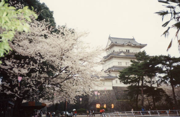 応永年間(15世紀初頭)より栄枯盛衰を重ねてきた小田原城址は、今では公園として整備され、昭和35年復興された天守閣の周りを始め、外堀の周りなどに約千本が咲き競う。