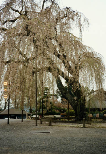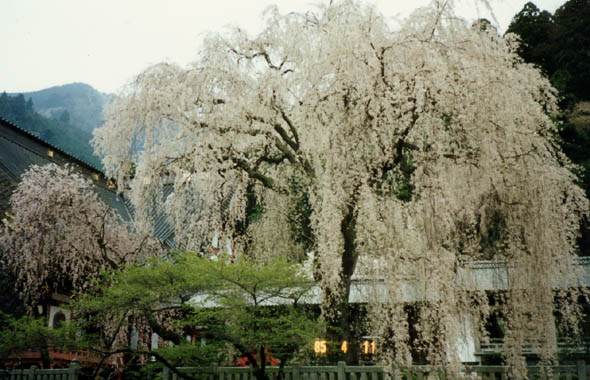 身延山久遠寺は日蓮宗の総本山。身延線の丁度中間地点である身延駅よりバスで15分程だが、花見時の土曜・日曜は大渋滞となる。広壮な三門をくぐり、287段の急な石段を登りつめて本院前に出ると、壮大な伽藍を背にした枝垂櫻が現われる。空から流れ落ちるように枝垂れる様子は壮観である。境内には他にも多くの枝垂櫻や紅枝垂櫻等が点在する。 |