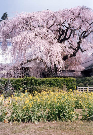 塩山市の東北方、中萩原地区の丘上に慈雲寺がある。歴応年中(1338〜1342年)夢窓国師開創と伝えられる古刹で、本堂前に1本の枝垂櫻の古樹がある。支柱もなく溢れんばかりに咲き誇る様は若々しい力に満ちている。手前の黄色い菜の花畑との取り合せも絶妙である。昭和46年市の天然記念物に指定。境内には樋口一葉文学碑がある。一葉の両親は当地の出身で、母親がこの寺で寺子屋の先生をしていた縁によるものという。塩山駅前には重要文化財「甘草屋敷・高野家住宅」がある。
