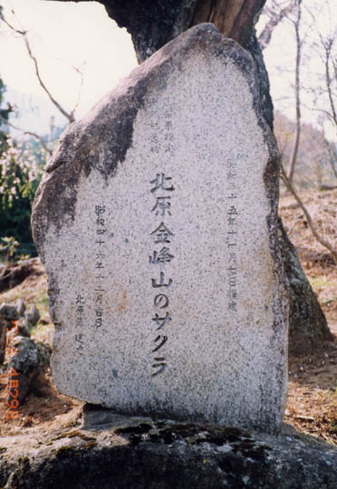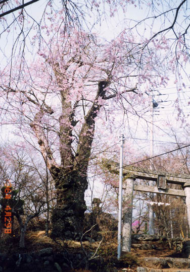 膝立の天王櫻から一旦牧平まで戻り、金峰山登山道を更に奥へ入る。地元の運転手さんも見逃してしまったこの樹は、道路脇の小高い丘にある小祠の傍らに立つ。石の鳥居の中央に「金峰山」の掲額があり、塚の上に小さな石の祠があるので金峰山の遥拝所であろうか。この樹も主幹の太さは相当なものだが、老木で枝張りが少なく、花付きも良くなかった。樹下には沢山の石仏や石碑が祀られていた。昭和35年、県指定天然記念物。