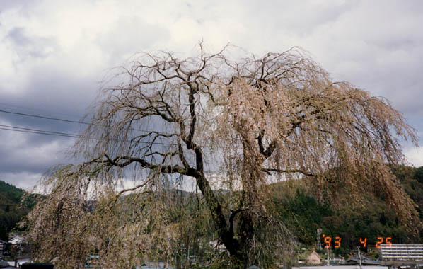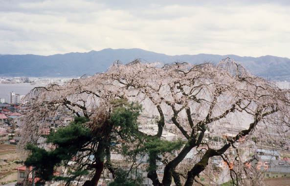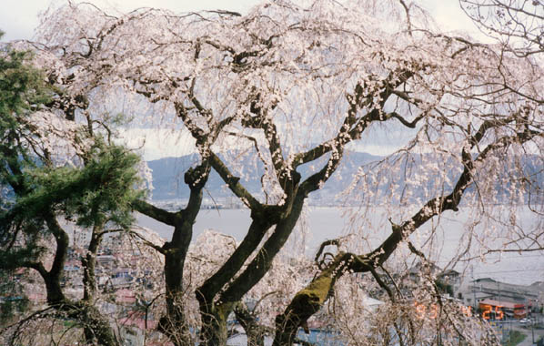 諏訪湖の北岸下諏訪町と諏訪市の接する高木地区に枝垂櫻の大木がある。旧甲州街道から山の斜面を大分登った所にあり、一寸散り始めていたが、樹冠が丸く抛物線を描き、のびのびと枝を拡げた素敵な姿である。眼下に諏訪湖を一望する景勝の地であるが、最近緑地公園化の工事が行なわれて、コンクリ〜トの擁壁に囲まれてしまい、直ぐ際に大きな鉄塔が建てられて興趣を損なうこと大である。保安工事は仕方ないが、鉄塔の方はもう少しずらせなかったものか。この樹にも岡谷の昌福寺と同じやうな由来が記されていた。もう1本これと同じ由来の樹が温泉寺にあるようだ。昭和56年、町指定天然記念物。付近の路傍や慈雲寺には枝垂櫻が、水月公園へ登る花見新道にはソメイヨシノの若木の並木があり、眼を楽しませてくれる。付近には諏訪大社など見所も多い。 |