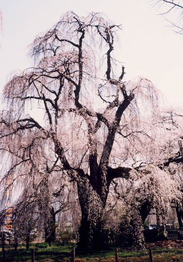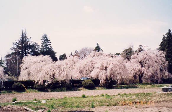 松本駅で松本電鉄に乗り換え20分ほどで三溝駅に着く。駅を下りるとピンク色の塊りが眼に飛び込んできた。道を挾んだ向こう側にある安養寺の枝垂櫻群である。境内に入ると何と先程のピンクの塊りよりもう一回りも二回りも大きい枝垂櫻群があるではないか。(全部で20数本)田圃の外に出て寺の周りを大きく一周。更に中に入って樹の下でと、その美しさを満喫する。満開のその姿は艶麗そのもの。立派な本堂の内部では抹茶のお点前がなされていた。安養寺には櫻の外も、庫裏の西側に三本杉やコウヤマキがあり、何れも樹高33米を越すたくましい巨木で、その歴史を物語っている。創設は建歴元年(1211年)と云われる古刹である。 |