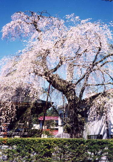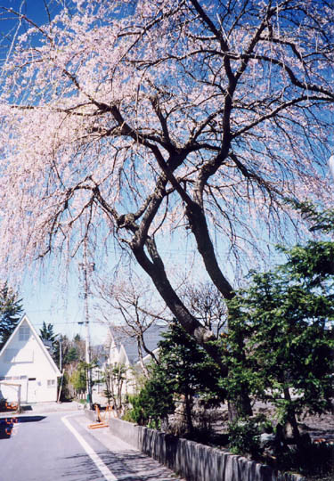 日本有数の避暑地軽井沢。標高が高いので櫻の咲くのも遅く、ゴールデンウイーク前後となる。人出で賑わい始めた軽井沢銀座を通り抜け、旧軽井沢ロータリーを右折、暫らく行くと神宮寺に着く。境内入口の角に枝垂櫻があり満開。樹齢350年の老樹だが支柱も1本だけ、どっしりとした主幹と枝張りで花付きも良く、見事な咲きぶりであった。通路と鐘楼に挟まれて窮屈そうなのが気になった。境内には他にベニヒガンザクラの若木が数本、眼を楽しませてくれた。付近には聖パウロカトリック教会がある。