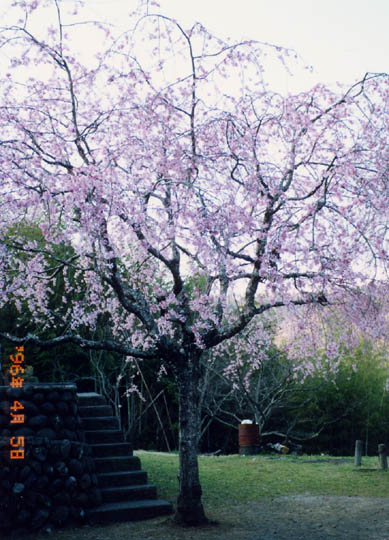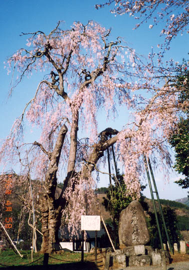 修善寺から下田街道を南下。柿木橋バス停付近を右折し、暫らく山中を行くと法泉寺に着く。380年程前法泉寺創建時に植えられた、当地方唯一の枝垂櫻の大樹がある。近年台風で主幹の一部を損じ拡がりには欠けるが樹高は高く、青空をバックに薄桃色の糸を垂らしたような姿は中々のものである。県指定天然記念物。境内には他にも1本、小振りながら容姿の整った里櫻が咲き誇っていた。