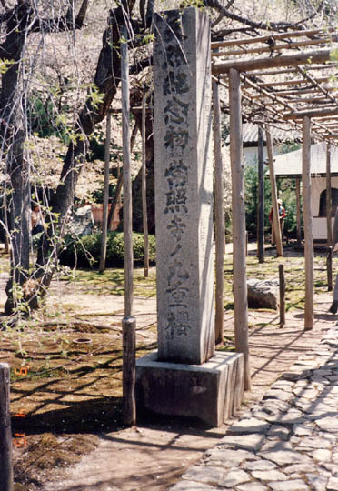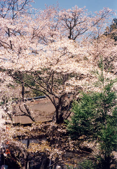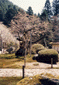 京都駅からバスに乗り、洛北高尾から北山杉の美林をぬけ、周山街道を北上すると1時間ほどで周山に着く。更にバスを乗り継ぎ15分ほど行った山国御陵前下車。歩いて5分ほどの所に常照皇寺がある。此所は南北朝時代、北朝第一世の光厳天皇が退位後、出家して開いた禅寺で、開山堂前庭に光厳天皇ゆかりの九重櫻と呼ばれる枝垂櫻がある。100年ほど前の火災で一部損傷。かっては枝張りも大きく垂れ枝も長く、シダレザクラの名木として昭和13年、国の天然記念物に指定された。現在は枝張り、花付き共良くないようだ。この木の枯損をおそれた京都の第4代佐野藤右衛門氏が、親木から接木して活着した2本を、昭和41年に移植された。又境内には戦国時代、戦火に遇った当寺の復興に力を致した後水尾上皇があまりの美しさに御車を返して見たという「御車返しの櫻」や有名な京都御所「左近の櫻」の親木と伝えられる木もある。寺を出てバス停に戻る路傍で素晴らしい容貌の紅枝垂櫻の若木に出会った。 |