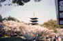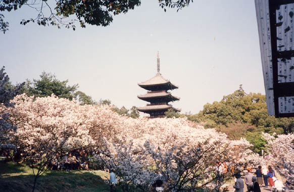 洛西高尾口近くに旧御室御所・大内山仁和寺がある。仁和4年(888年)宇多天皇の開山で江戸時代以降に再建された堂塔伽藍が多く残されている。中門を入ると左手に、湧きあがる紅雲のような御室櫻が眼に飛び込んでくる。この櫻は株立ちで樹高が低く非常に特徴のある樹形をしている。この原因は土質によるものらしい。白色単弁の「有明」という種類が多いようだが全部で十数種類の里櫻が二百余株植えられており、大正13年名勝に指定されている。櫻越しに見る五重の塔の姿が美しい。 |