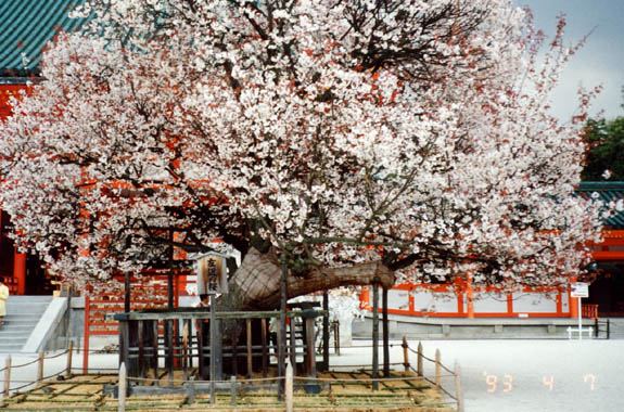 深い緑のなかに丹色の社殿が鎮まり、向かって右側には「左近の櫻」が大きく枝を拡げて咲き誇っていた。