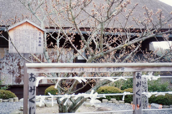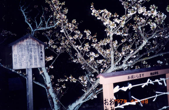 東山の清水寺。有名な「清水の舞台」を出て直ぐ左に廻り込むと、縁結びに大変ご利益があるという地主神社がある。社前に地主櫻と名付けられた櫻があり、由来書によると八重と一重の花が同時に咲く珍種で日本でも此所1本だけとの事。初代の樹は明治初年に枯死したが、その後昭和37年京都の名園芸家、佐野藤右衛門氏の助力で移植に成功したもの。嵯峨天皇が車を返して賞でたという伝説や、謡曲や詩歌、文楽などにも登場したことが伝えられている。「その上の地主の櫻の花の下恋い占いの石おもしろき」