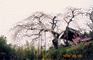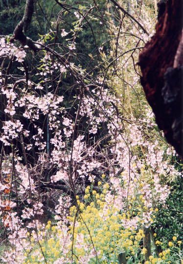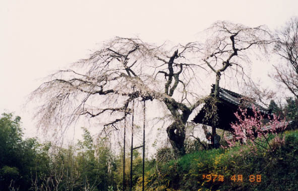 京都府の南端に近い木津川沿いの井出町。JR玉水駅より東へ2km程の井出山の中腹に、玉峰山地蔵院がある。急な石段を登りきった本堂左手の鐘楼の傍らに枝垂櫻がある。この樹は戦前「祇園の夜櫻」として天下にその盛名を謳われた、京都円山公園の枝垂櫻の兄弟木で、亨保12年(1727年)に植えられたとされる古木である。木津川の流れを望む景勝の地で鐘楼をバックに、南側に大きく腕を差し伸べたような姿は豪快そのものである。花期が過ぎたのと、花付きも余り良くなかったのが残念だった。それでも境内はリュックを背負った人たちで結構賑わっていた。昭和62年府指定天然記念物。因みに現在の円山公園の枝垂櫻は、この木の兄弟木であった先代の親木が昭和22年枯死した後、現代の名樹医・佐野藤右衛門氏が2代かけて、その種から丹精こめて育てられたものである。玉水駅近くの玉川土手では井出櫻まつりが開かれており、満開の櫻を楽しむ人々で賑わっていた。又道路越しに酒造工場の蔵が望まれたが割愛。 |