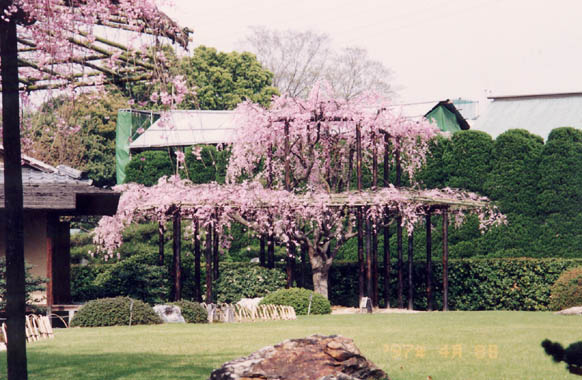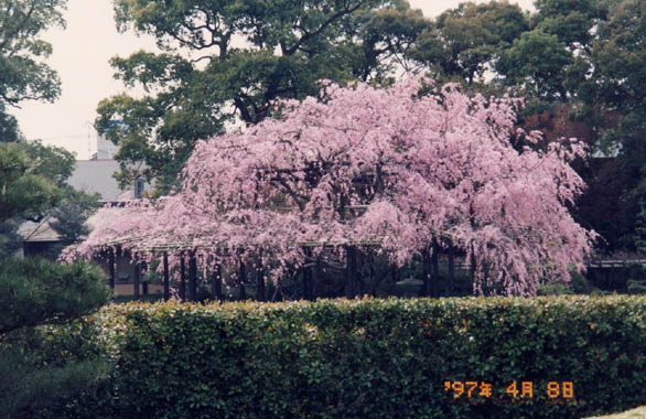 京都駅の真南、近鉄武田駅より無料送迎バスが出ている。上古神功皇后以来の由緒を誇る古社で、現在では、普請・造作・転宅等の方除けの神として信仰厚い宮で、春秋の曲水の宴などでも知られている。社殿南方の神苑内に大きな紅枝垂櫻がある。二十数本の支柱に支えられて、大きく枝を伸ばした姿も良く、紅色の糸を垂らす様は寔に豪華絢爛たるものがある。苑内は人影も少なく、素敵なロケーションに暫し逍遥。東側にも1本小振りな紅枝垂櫻が咲き誇り中々立ち去り難い思いに駆られる。 |
