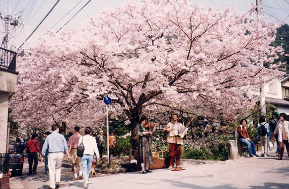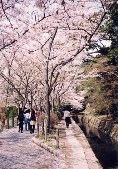 洛東・銀閣寺から若王子神社に至る、琵琶湖疏水支流沿いの道で、かって京都大学の哲学者、西田幾太郎が散策したので哲学の道と名付けられた。ここの櫻は大正7年頃、日本画家・橋本関雪が寄贈した櫻苗が始めで、その後京都市が引き継き植え継いで櫻の名所になったという。ハラハラ散り始めた櫻道には途中山吹の黄色、ミツマタの白い花が彩りを添え、西洋人楽士のパフォーマンスが興を添えていた。 |