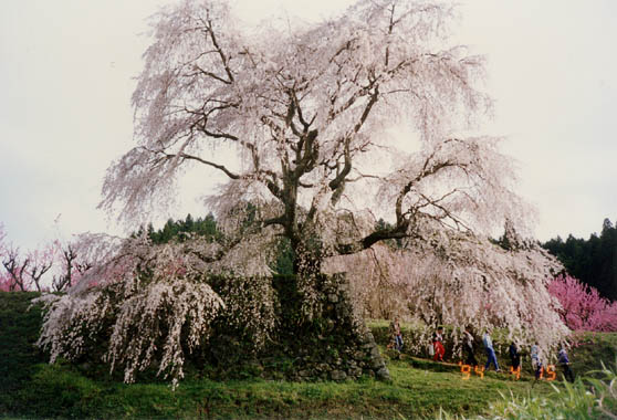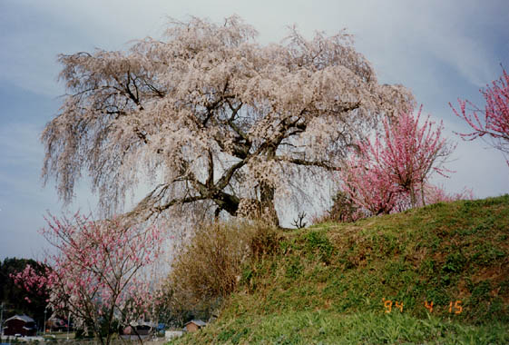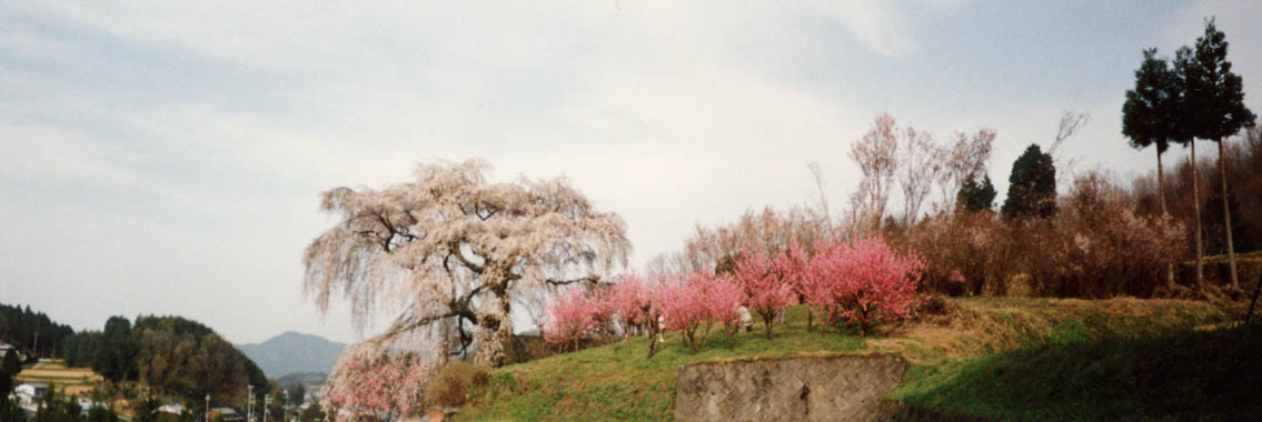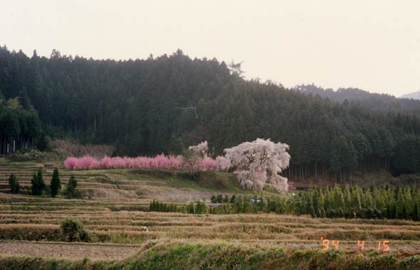 近鉄榛原駅から吉野街道を南に下り、大宇陀町役場の先を右折すると本郷地区に至る。車を下りて田圃の中の細い道を2〜300mほど行った小高い丘の上に目指す櫻はあった。この櫻は昨年8月にJRの車内中吊りポスターで初めて見て気に入り、開花状況を確かめて来た次第で、その満開の姿は期待に違わず、妖艶なばかりの美しさであった。此所は石垣の上の小高い場所で、櫻も見事だが、バックにピンク色の桃の木が連なり、絶妙の雰囲気を醸しだしている。平日の夕方にも拘らずかなりの人出である。聞く所によると人が来始めたのはここ数年のことらしい。私もポスターに魅せられてやって来た一人だが。この地は大阪夏の陣で活躍した後藤又兵衛ゆかりの地なので、最近この木を「又兵衛櫻」と名付けたようだ。近くに「かぎろいの丘万葉公園」や重要文化財の「片岡家住宅」と「笹岡家住宅」や、古い町並みが残っている。 |