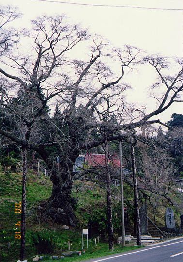 高萩市上手綱にある「県指定有形文化財・穂積家」で、下君田地区に山櫻の巨樹があると聞き、関根川に付いて県道高萩・塙線を北上、30分程で下君田地区の松岩寺に着く。急な階段の参道脇に立つ櫻は、樹高25m、幹周り5.5mもある山櫻の巨樹である。傍らに貼ってあった櫻祭りポスターの「茨城県櫻見立番付」によれば山櫻の部で東の横綱を張っていた。残念な事にこちらも蕾は固かった。