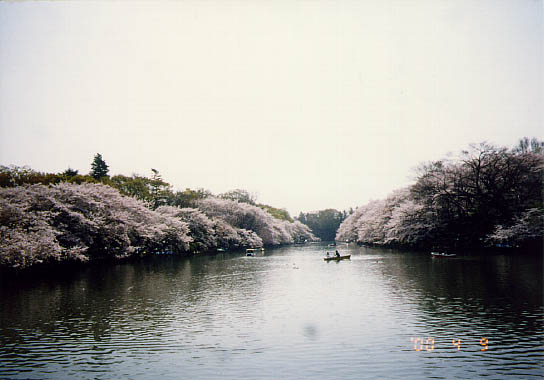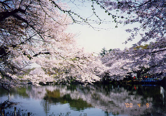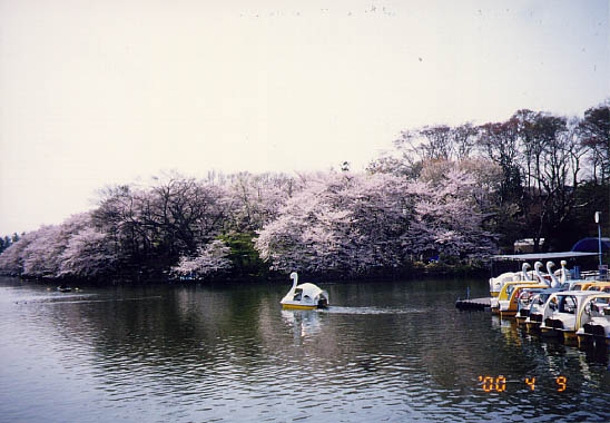 此所は武蔵野の湧水池の一つ井の頭池と御殿山を中心に、武蔵野の面影を残す自然林に囲まれた都立公園で広さ36.4ヘクタール、大正6年の開園である。園内には昭和10年頃植えられたソメイヨシノが500本、満開の枝を水面すれすれに差し伸ばしていた。園内には自然文化園、水族館等があり、スポーツレクリエーションにも適した公園である。一寸足を伸ばせば山本有三記念館もある。