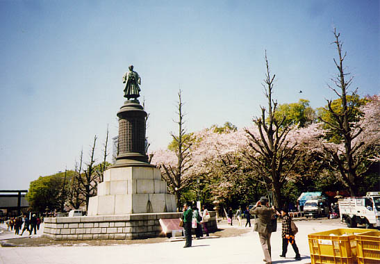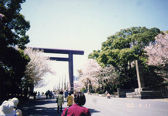 靖国神社は明治2年創建の東京招魂社の後身で、明治12年現在の社号に改められた。明治維新前後以来の戦死者の霊を祀る。皇居西北の九段坂上のこの地を選んだのは洋式軍制の創始者・長州出身の大村益次郎である。その功績を偲んで明治26年外苑中央に彼の銅像が建立された。境内には沢山の櫻が植えられており、能楽堂付近にある3本のソメイヨシノが東京地方の櫻開花日を知らせる標準木である。毎年4月上旬に行なわれる千代田さくらまつりには沢山の露店も出て、大勢の参詣客で賑わう。