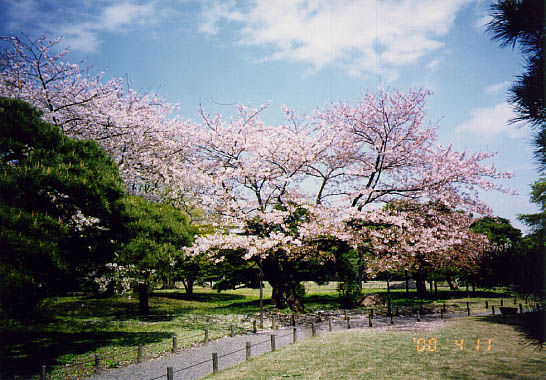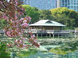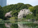 徳川将軍家の別邸として「浜御殿」と呼ばれた江戸時代の代表的な大名庭園。明治維新後皇室の離宮となり、昭和20年東京都に下賜されてから整備の上、一般公開された。戦前まで使われていた鴨場を始め、隅田川の水を引き入れた潮入りの池など、水辺の風景が楽しめる。隅田川水上バスの発着場にもなっている。園内にソメイヨシノは少ないがサトザクラなど130本が花期をずらせて咲き誇る。足の便が悪いせいか来園者少なく、お薦めスポットである。