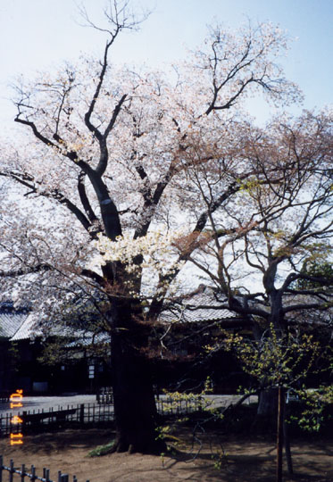 弘道館は天保12年(1841年)水戸・徳川家第9代藩主・徳川斉昭によって、水戸藩の学校として創建され、水戸学発祥の地としても、全国にその名を知られている。その正庁玄関前、右手に1本の山櫻(左近の櫻)がある。先程見た偕楽園の左近の櫻と兄弟樹で、同じ昭和38年(1963年)に移植されたもの。こちらも満開で宛然と微笑んでいた。唯こちらの方は、周りの環境が狭いので、偕楽園の樹より小さい様だ。苑内には梅の樹に混ざり山櫻の古櫻が20本程ある。苑全体は国の特別史蹟に指定され、正門、正庁、至善堂は国の重要文化財に指定されている。 |