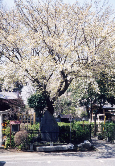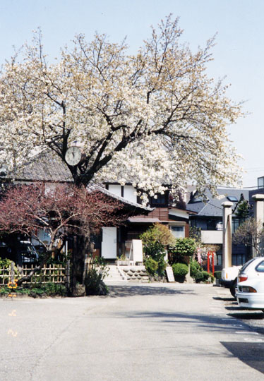 この社は、天歴2年(948年)加賀一宮・白山神社を本郷元町に勧請したのが創りで、元和2年(1616年)徳川2代将軍秀忠の命により巣鴨原(現在の小石川植物園)に移ったが、その後5代将軍職につく前の、館林侯綱吉の屋敷造営の為、明歴元年(1655年)現在地に再度移った。明治元年勅祭神社に準じられ、東京十社の一つに数えられている。境内南側にある八幡神社社殿右側に、八幡太郎義家が戦勝を祈願したという「旗櫻」がある。花の真に旗の形をした花弁があるという名花で、今日は8分咲き位か、どっしりとした姿の良い樹である。旗櫻は入口駐車場付近にも1本あった。又本殿左側には紅枝垂櫻の大きな若木もある。こちらは8分咲き位で、花付きも今少し良くなかった。本殿後ろの公園にはソメイヨシノの古木や枝垂櫻の若木が満開だった。ここは梅雨時のあじさいの方が有名で花の時期には沢山の人が訪れる。 |