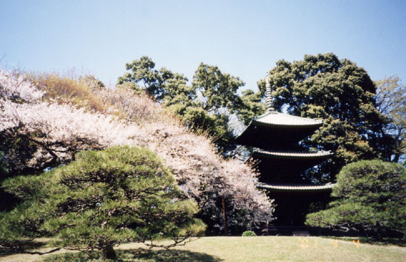 ここは江戸時代、上総国(千葉県)久留里藩主・黒田豊前守の下屋敷であった。明治に入り山県有朋の屋敷となったが、邸内に椿の木が多かったので、椿山荘と呼ばれた。大正時代に藤田家の所有となり、今ではホテルとして賑わっている。起伏に富んだ広大な庭は19世紀末の作庭といわれ、一般に開放されている。苑内はに広島より移築したという室町時代末期の三重塔があり、その傍らに大きく羽を伸ばしたような櫻が満開だった。