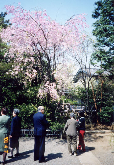 本行寺は大永6年(1526年)太田道潅の孫、太田資高の開基である。資高の父資康は相州三浦で討ち死にしたので、その13回忌の菩提を弔うため、始め平川口に創建された。その後、神田、谷中を経て宝永6年(1709年)現在地に移る。古くから観月の名所で別名「月の寺」とも呼ばれている。境内には小林一茶や、種田山頭火も訪れており句碑もある。本堂前の紅枝垂櫻1本満開、白枝垂櫻1本葉櫻、梨の花が1本満開。何れも樹高が高く見応えのある樹であった。