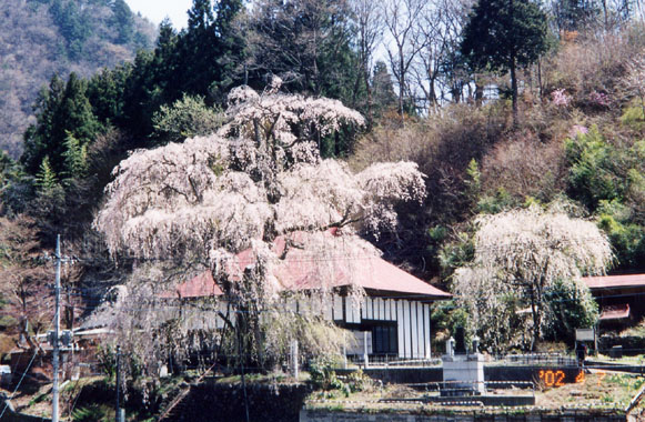 群馬県の西南部最奥、長野・埼玉両県と境を接する上野村に中正寺がある。例年5月5日に行なわれる「火渡り」でも知られる寺である。本堂左手の崖の際に大きな枝垂櫻がある。永正年中(1504~1520年)中正寺中興の時、實仙和尚が比叡山延暦寺より持ち帰ったもので、通称「仏乗櫻」と呼ばれている。満開は一寸過ぎた様だが、すっかり晴れ上がった青空ををバックに婉然と微笑む姿は値千両。昭和33年県の天然記念物に指定。近くに、国指定重要文化財の旧黒沢家住宅がある。直通バス便が少ないので要注意。