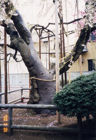 地蔵院は鎌倉時代創建の古刹であるが、その後火災などを経て、平成8年再興された様である。山門を入った本堂右手に枝垂櫻の古木がある。高さは低いが傘型の姿の良い木で、花期は一寸遅く葉桜になりかかっていた。平成10年に樹勢回復の措置が取られたようだが、根元から主幹部にかけての手術の跡が痛々しかった。昭和53年町の天然記念物に指定された。境内の数本のソメイヨシノは見頃を迎えていた。