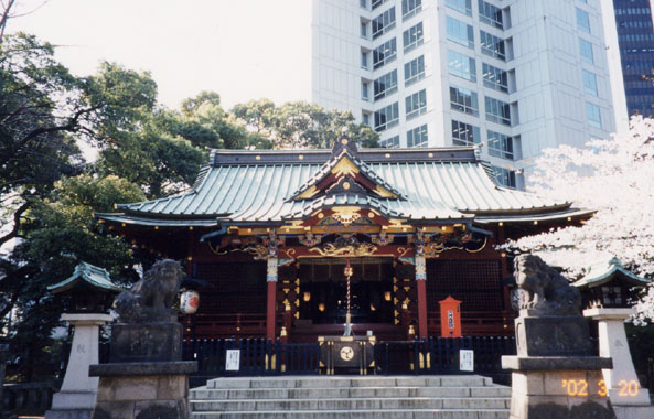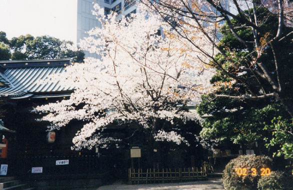 この社は元、渋谷八幡宮と称したが、金王丸の名声に因み改称したものである。金王丸は平治物語や平家物語などにも登場する武将。この神社の本殿右手に1本の櫻があり、丁度満開だった。この櫻の元木は、源頼朝が奥州征伐の帰路立ち寄り、金王丸の忠誠を偲んで鎌倉の館より移植したものとされている。花の種類は八重と一重が交ざって咲く珍しいもので、現在の樹は先の宮司が大正の始め、実生から育てたものという。境内には芭蕉の「しばらくは花のうえなる月夜かな」や一茶の「名木も何代目ぞやかこむ鳥」などの句碑がある。江戸時代初期から白山神社の旗櫻、柏木・圓照寺の右衛門櫻と共に江戸三名櫻の一つに挙げられていた。昭和57年(1982年)区の天然記念物に指定。 |
