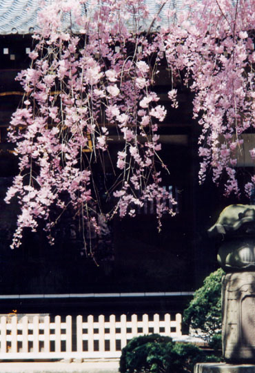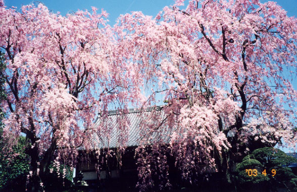 観泉寺から東へ1qほど行くと妙正寺に着く。ここは日蓮宗の寺で、文和元年(1352年)草創とつたえられる古刹である。本堂手前、左右に2本の紅枝垂櫻 。まだ若木の様だがすんなりと伸びた枝先は大きな輪を描き、素晴らしい咲き様であった。裏門を出た墓苑の一角にも大きな染井吉野櫻が満開だった。遠方からでも目立つ樹である。すぐ裏が妙正寺公園である。