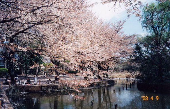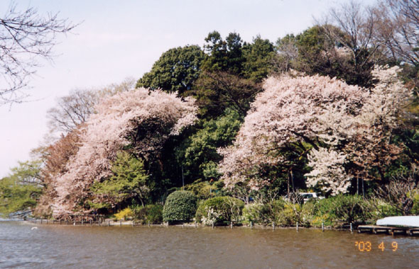 観泉寺裏の早稲田通りを西へ1.5qほど行った所に善福寺公園がある。武蔵野の湧水池、善福寺池を中心に染井吉野櫻など約200本がある。上の池にはボートも漕ぎ出され賑わっていた。池の水は善福寺川となり、善福寺川緑地公園、和田堀公園を経て神田川と合流、隅田川に注ぐ。近くに井草八幡宮がある。