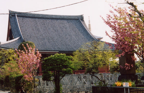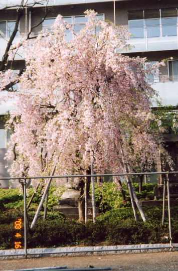 浅草寺の本堂裏広場と隣家の境に1本の枝垂櫻 があった。まだまだ若木だが姿が美しいのでこれからが楽しみな樹である。またこの付近には八重櫻が何本か植え込まれていて、ソメイヨシノの終わった境内を彩っていた。
